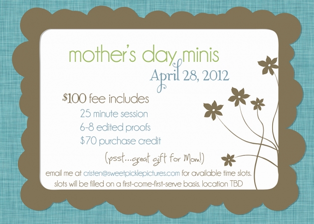 Wow, spring has sprung with a vengeance and that means it’s time for some Spring mini sessions! Last year I held my first round of “Mommy and Me” mini sessions and I absolutely loved being able to capture some wonderful moments between mommies and their little ones. As a mom myself, I know how few and far between those kinds of photos can be. Oftentimes, we are the camera holders and not the ones on the other side. This year I want to honor motherhood again with my mini sessions. Maybe you’re a busy mom who wants some current photos with your little (or not so little) loves, or maybe you’re a mom with a bundle on the way who wants to capture the joy of your first Mother’s Day! Or maybe you just even want some great pictures of yourself for a change….well, this is a great opportunity and at a GREAT price. Short and to the point, these sessions last 25 minutes and I typically proof 6-8 edited images for you to choose from. My pricing for these sessions includes a $70 purchase credit that goes straight towards your purchase of prints, collections or digital files – no more being limited to just a few prints or a few sizes – you really can order whatever your heart desires! Full price list available upon request, just shoot me an email through my site here or you can even message me through my facebook page now (click on the facebook link in my menu to get there.) Spots are VERY limited unfortunately, so first-come-first-serve. Payment of full fee is due in order to reserve your spot.